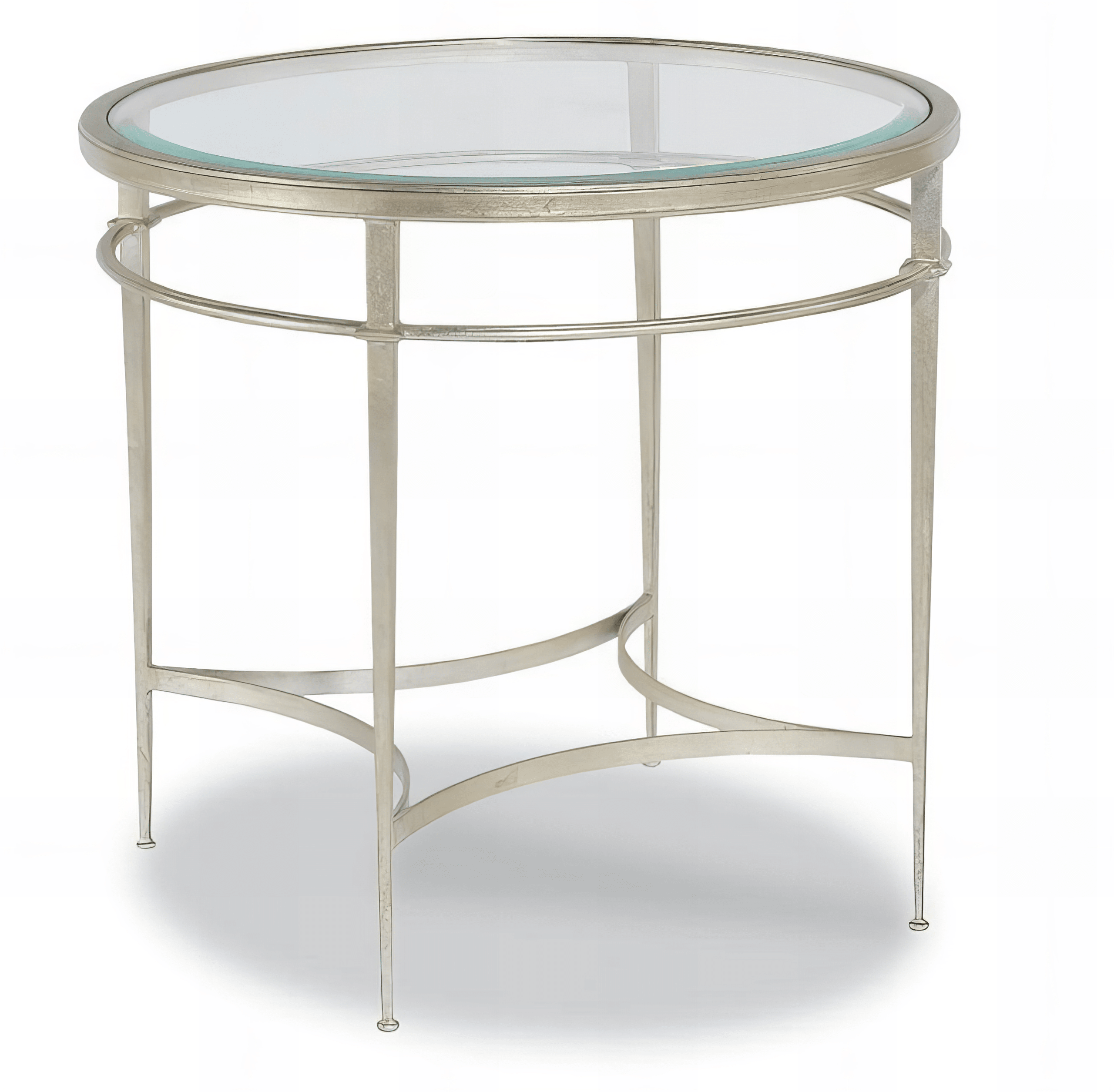 A unique table inspired by 19th Century French originals with a round “½” beveled glass top that is fitted inside a top frame. The top frame is elevated by gracefully tapering posts, joined by shaped stretchers. The table is crafted in forged steel, finished in silver leaf with antique patina or often referred to as champagne gold.
