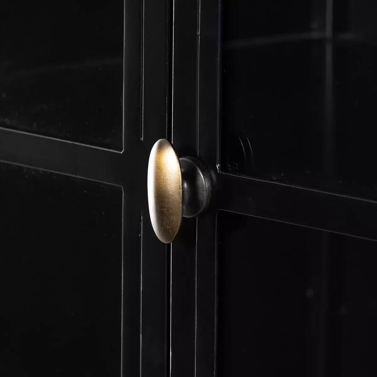 Display your favorite treasures in this arched cabinet with a glass pane detailed door. Made of solid iron and finished in soft, matte black with contrasting brass hardware.