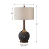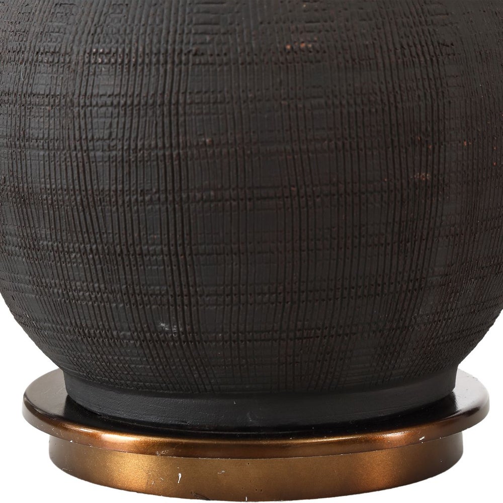 This ceramic base features a textured, matte black hand-scored body, accented with a metallic golden bronze glazed neck, paired with antique brass plated details. The round hardback drum shade is a light gray linen fabric.