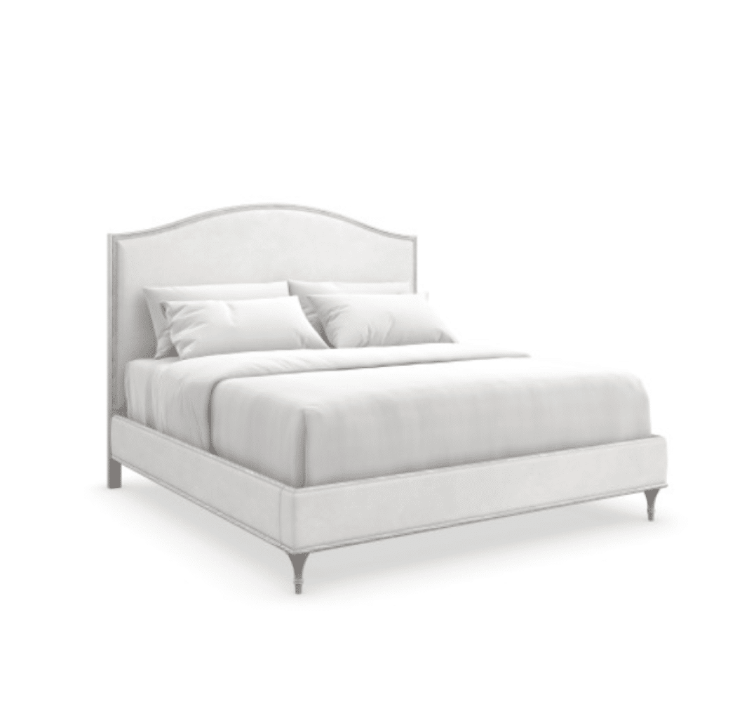 Fully upholstered bed with wood trim finished in an oracle silver leaf finish. Available in white. Available in King or Queen. Pairs well with the shining star bedside table.