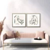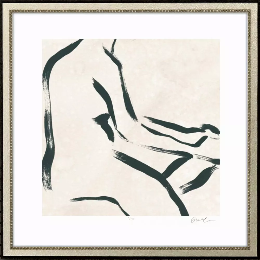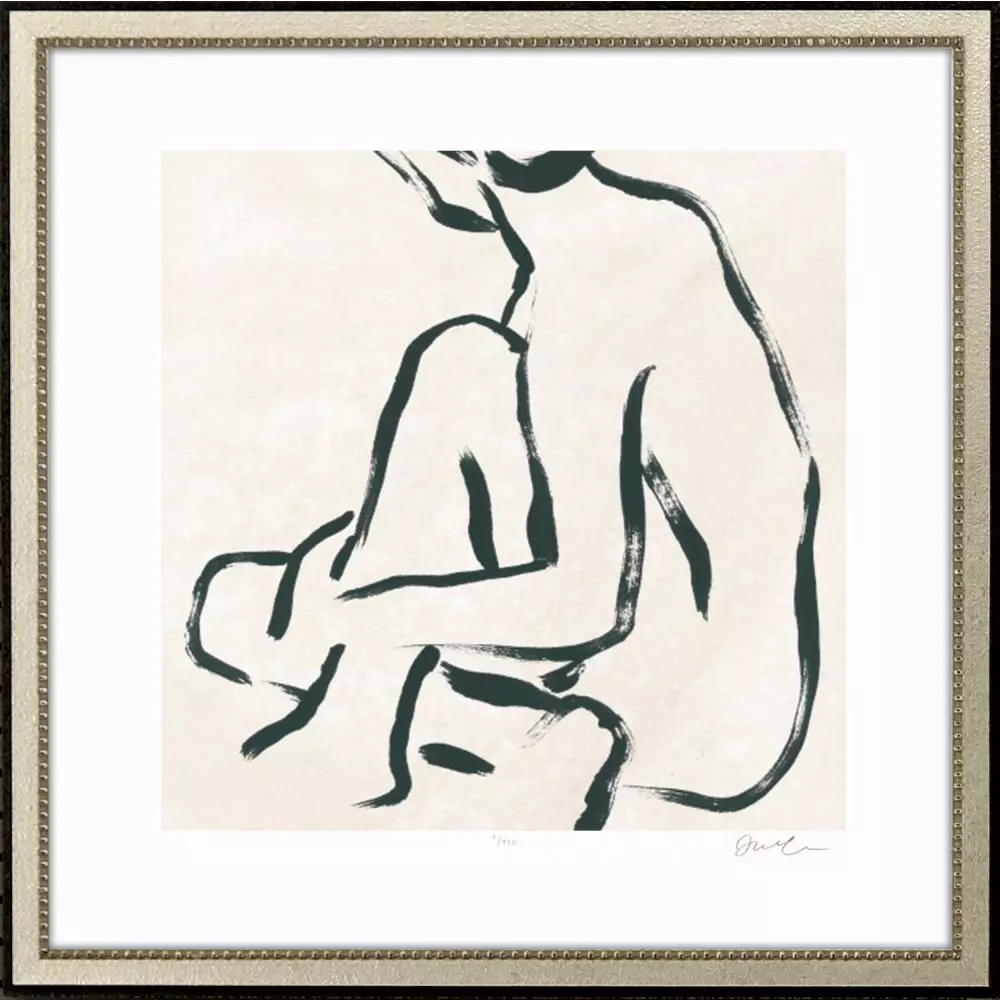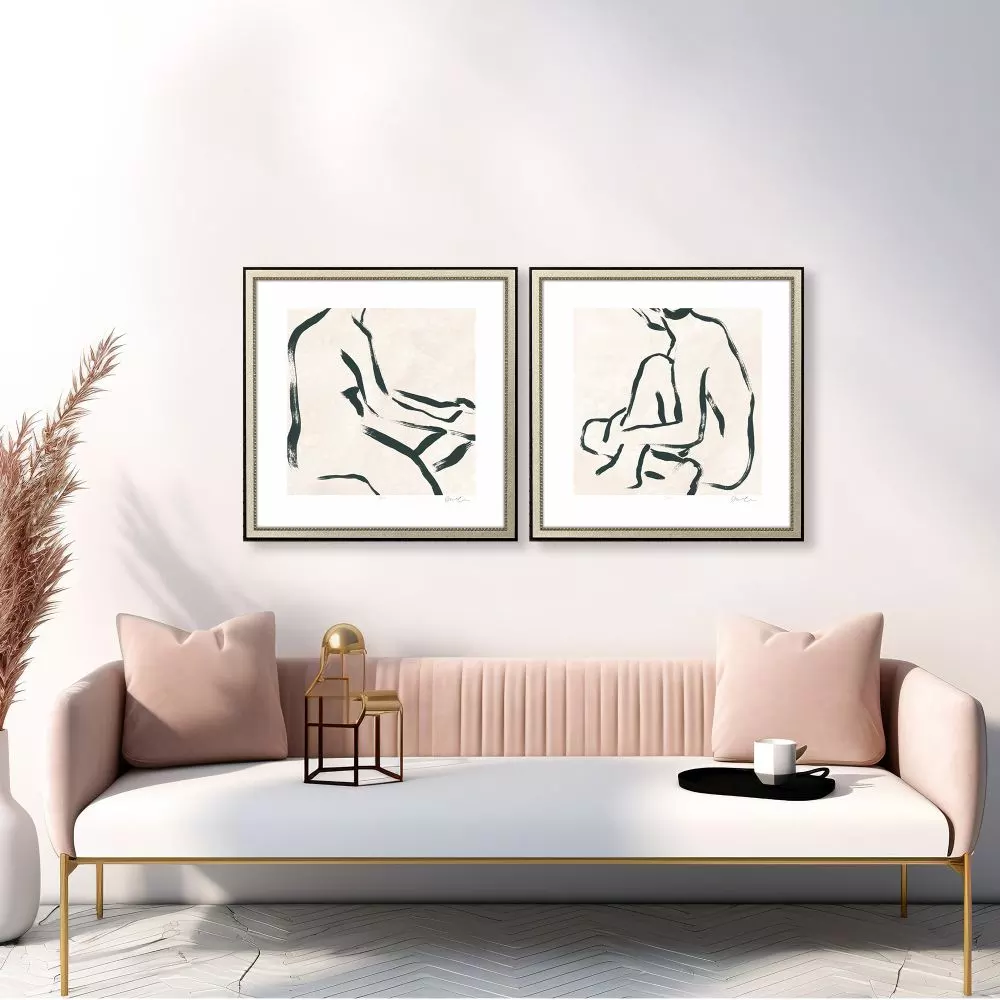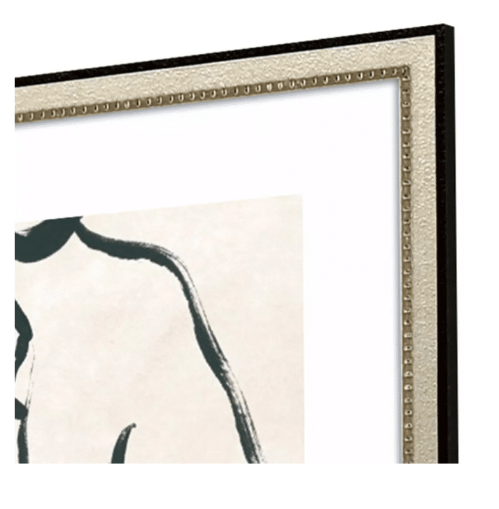 Modern sketches on fine art paper are framed in a traditional step profile wood with distressed silver leaf and beaded lip with black painted edging.