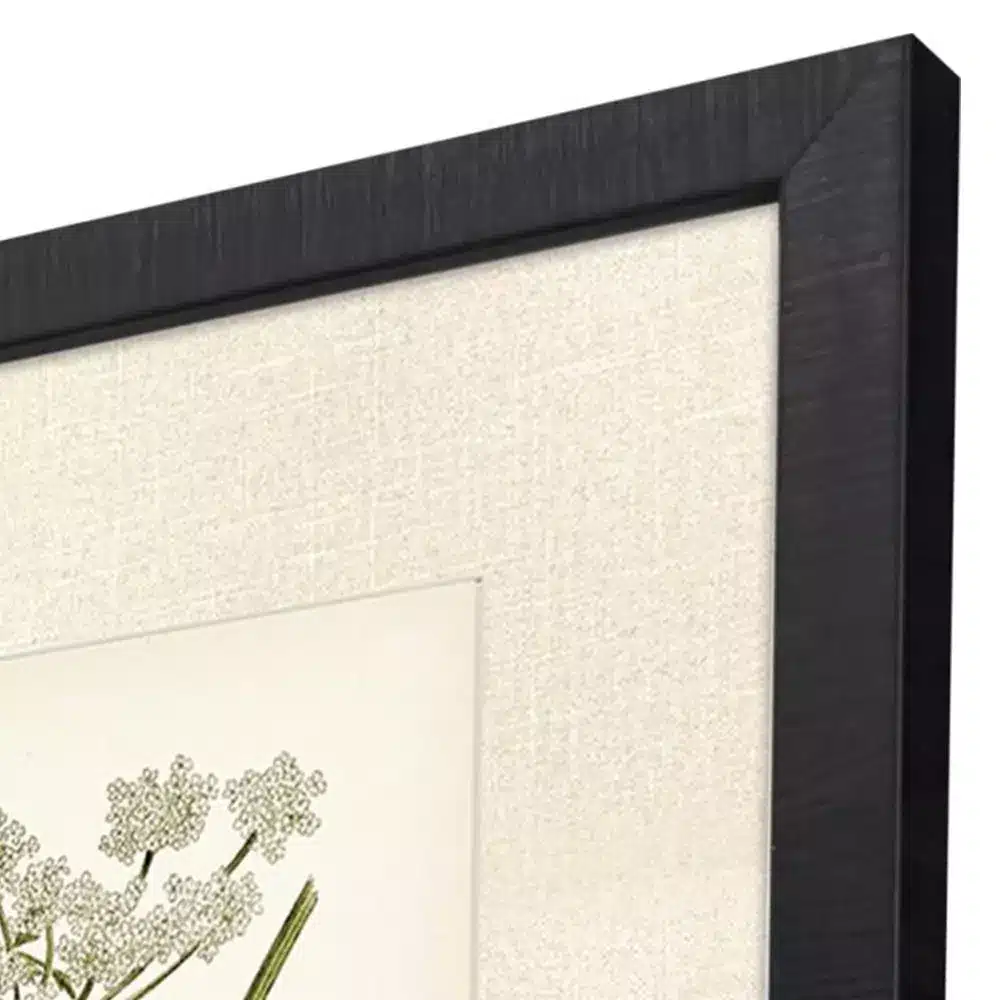 Queen Anne’s lace botanical prints add a gentle touch of nature. Featuring premium matting and framed in a dark espresso wood finish moulding.